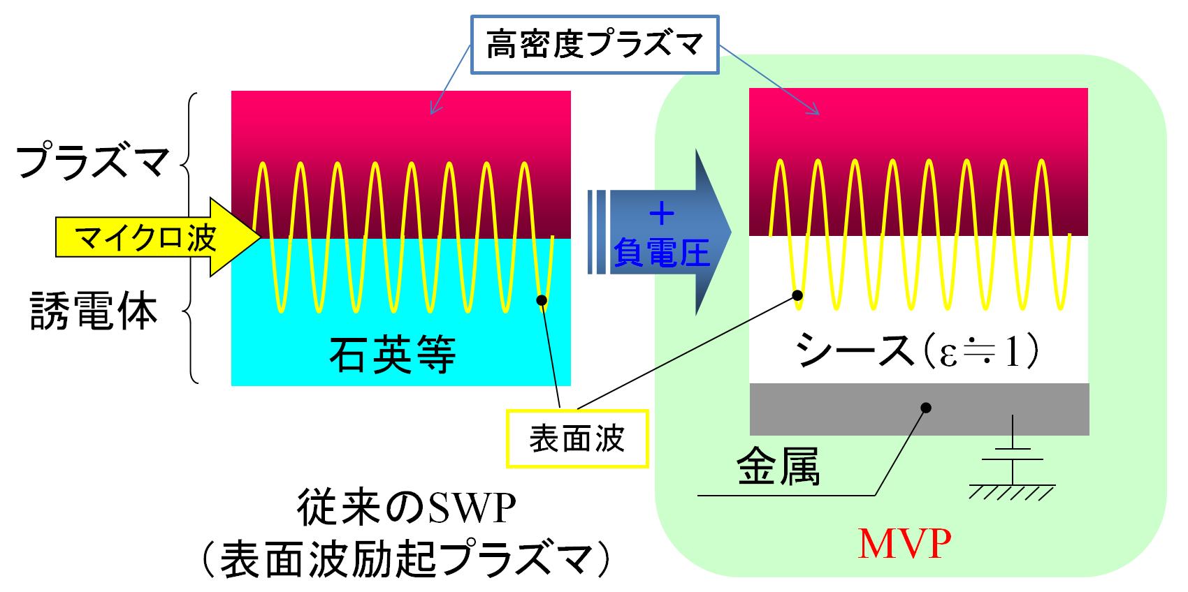 図-2 従来のSWP(Surface Wave-excited Plasma)と新しく開発したMVP(Microwave-sheath Voltage combination Plasma)の比較