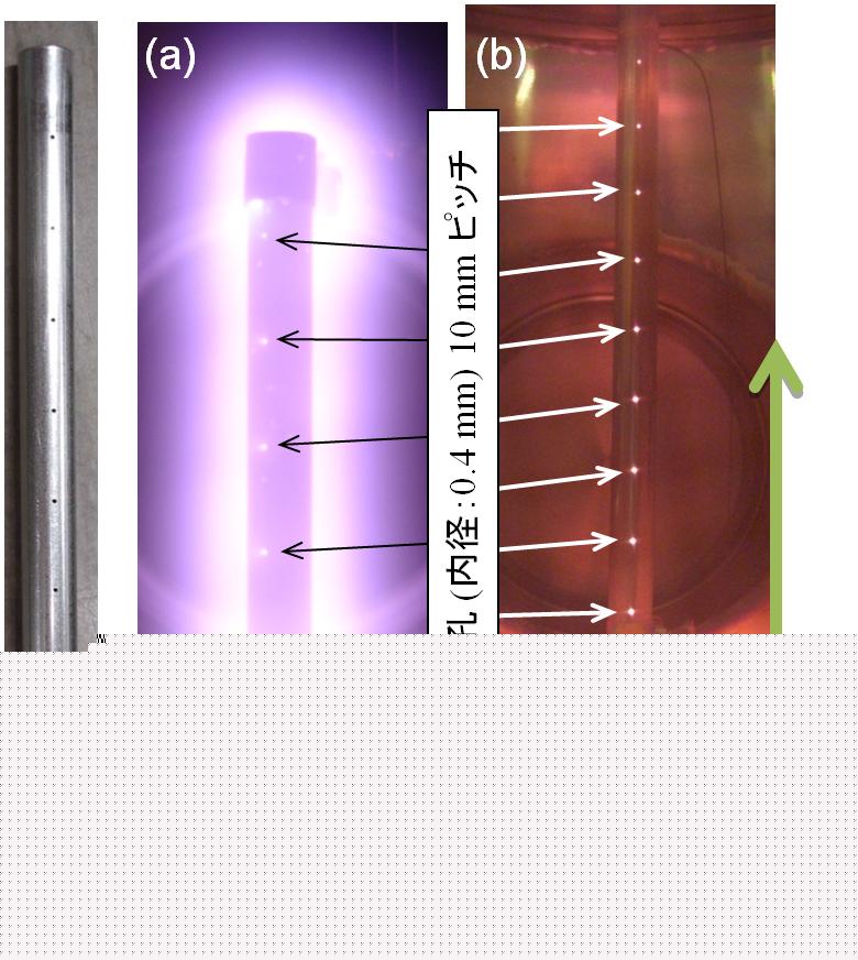 図-4 1/4インチステンレス鋼製パイプ内面(内径:4.4mm)でのプラズマ生成。パイプ側面にあけた微細観察孔からの漏洩光によって内面でのプラズマ生成が確認できる。(a)パイプ長:75mmの内外面でプラズマが生成されている、(b)パイプ長:150mmの内面のみでプラズマが生成されている