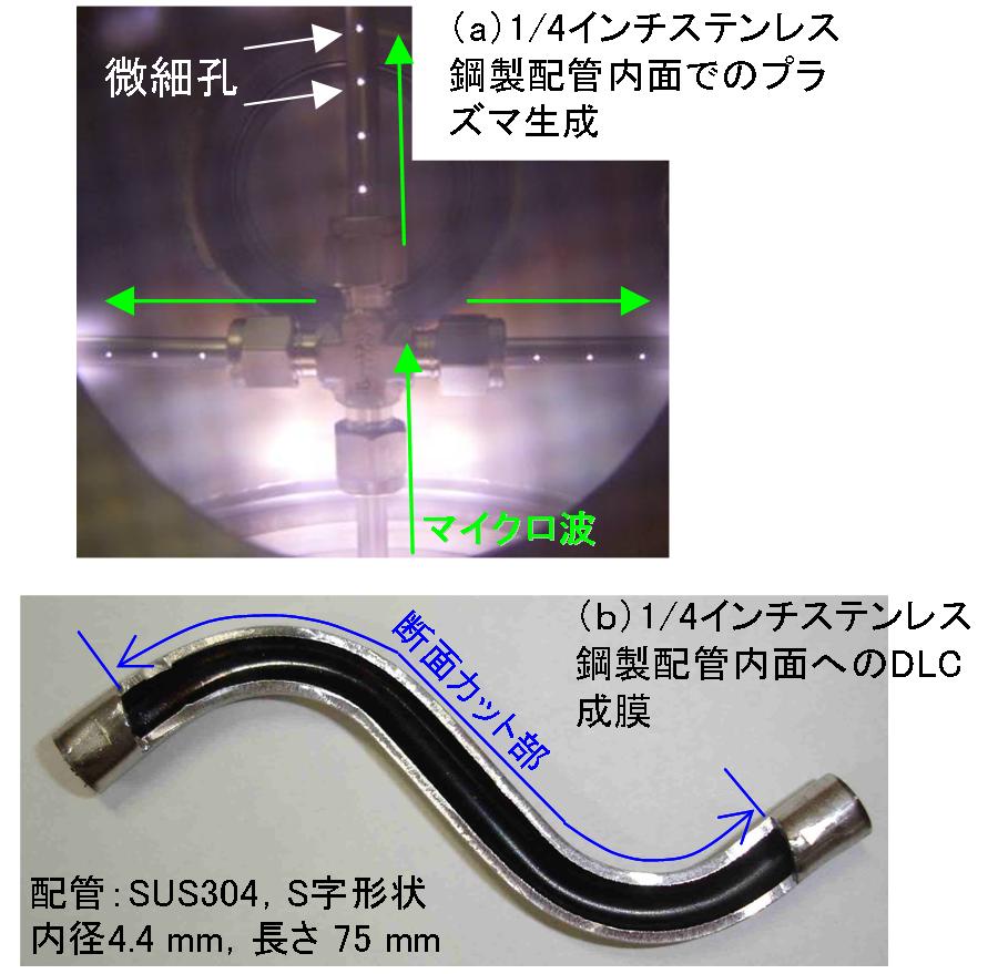 図-8 本稿で紹介する新開発手法による、1/4インチステンレス鋼製配管内面における(a)プラズマ生成、および(b)DLC成膜の結果。(a)においては、微細孔から漏洩する発光により内面プラズマの生成が確認される。新開発手法は分岐や曲がりにも対応する