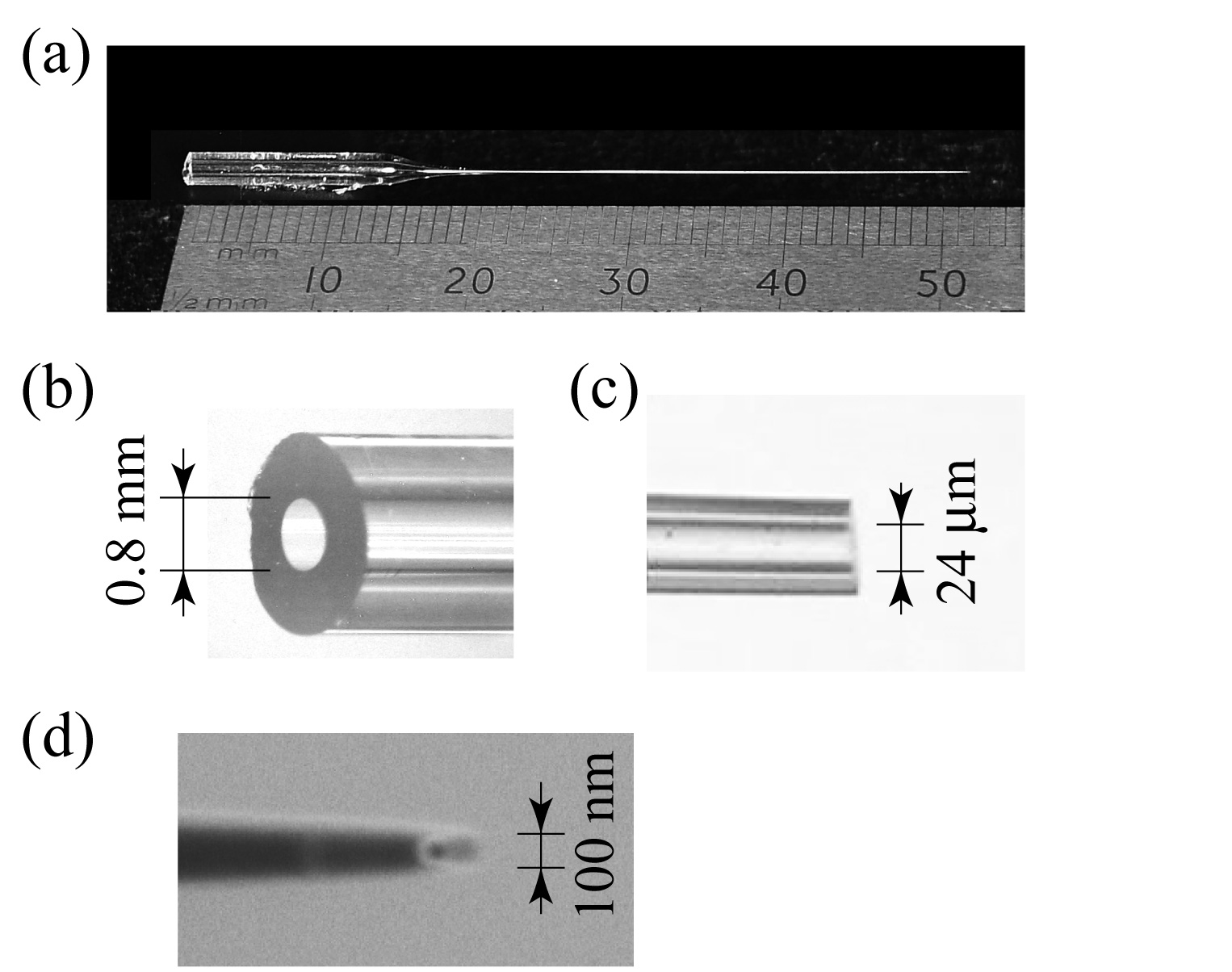 図-1 (a)ガラスキャピラリーの全体像、(b)ビーム入口付近、(c)ビームサイズが24μmφになるように切断された出口付近、(d)pullerで作製された直後の出口付近