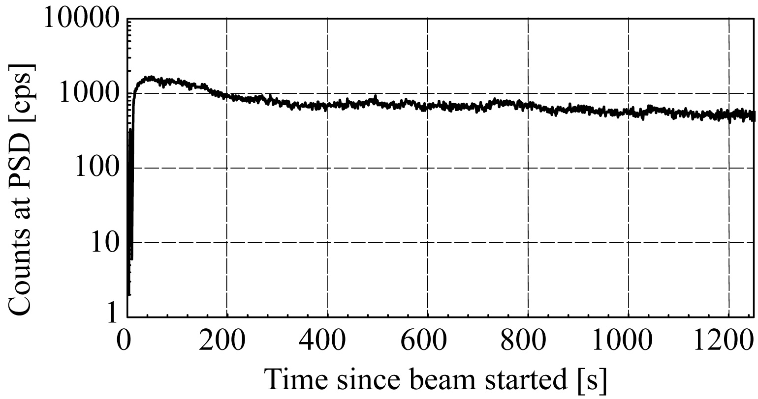 図-3 通過イオンビーム強度の時間変化(出口径24μm)。通過強度の立ち上がりに50秒くらい要しており、この50秒間が自己組織化帯電分布の形成に費やされたと考えられる