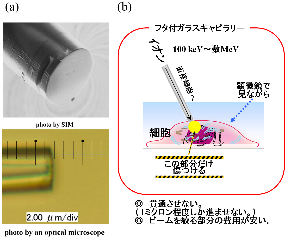 Tapered glass capillary has been used to produce micro/nano-meter sized beams of both keV-energy highly charged ions and MeV-energy proton or helium ions. We have employed this low-cost technique to realize micro-patterning on the sample surface by efficient potential spattering of slow highly charged ion microbeams and cell surgery aiming at the dysfunction of a single organelle in a living cell by proton or helium ion microbeams. [References]