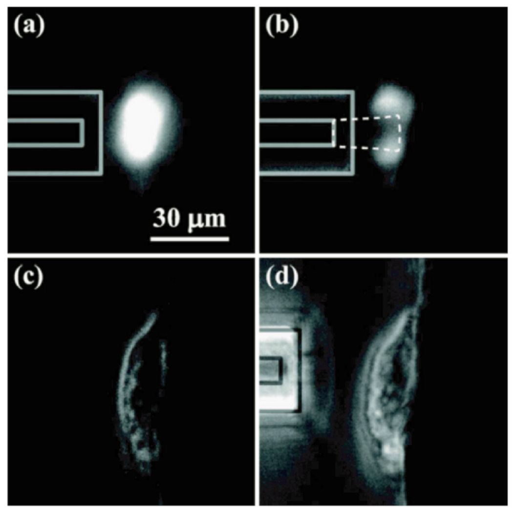 図-6 ヒストンとGFPの融合タンパク質でラベルされた核をもつHeLa細胞への照射前と後の写真:蛍光イメージによる照射前(a)と照射後(b)、および位相差顕微鏡でのイメージによる照射前(c)と照射後(d):(d)では、照射が終了してガラスキャピラリー先端を細胞から離したところ。また、(b)の点線領域はSRIM-2006によるシミュレーションで予測した被照射領域